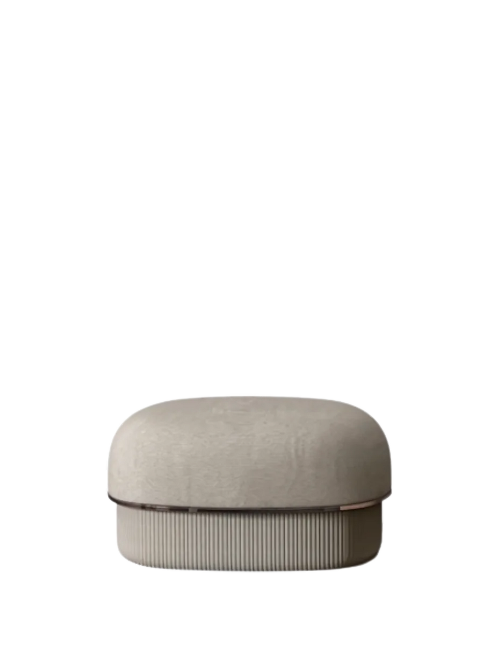 The Modern Gentle Small Pouf is a perfect blend of elegance and functionality. Its smooth, upholstered top is complemented by a quilted leather base with vertical stitching, creating a striking 3D texture. A bronze metal ring adds a refined, reflective accent, enhancing its sophisticated design. Compact yet stylish, this pouf is a versatile addition to any contemporary space.